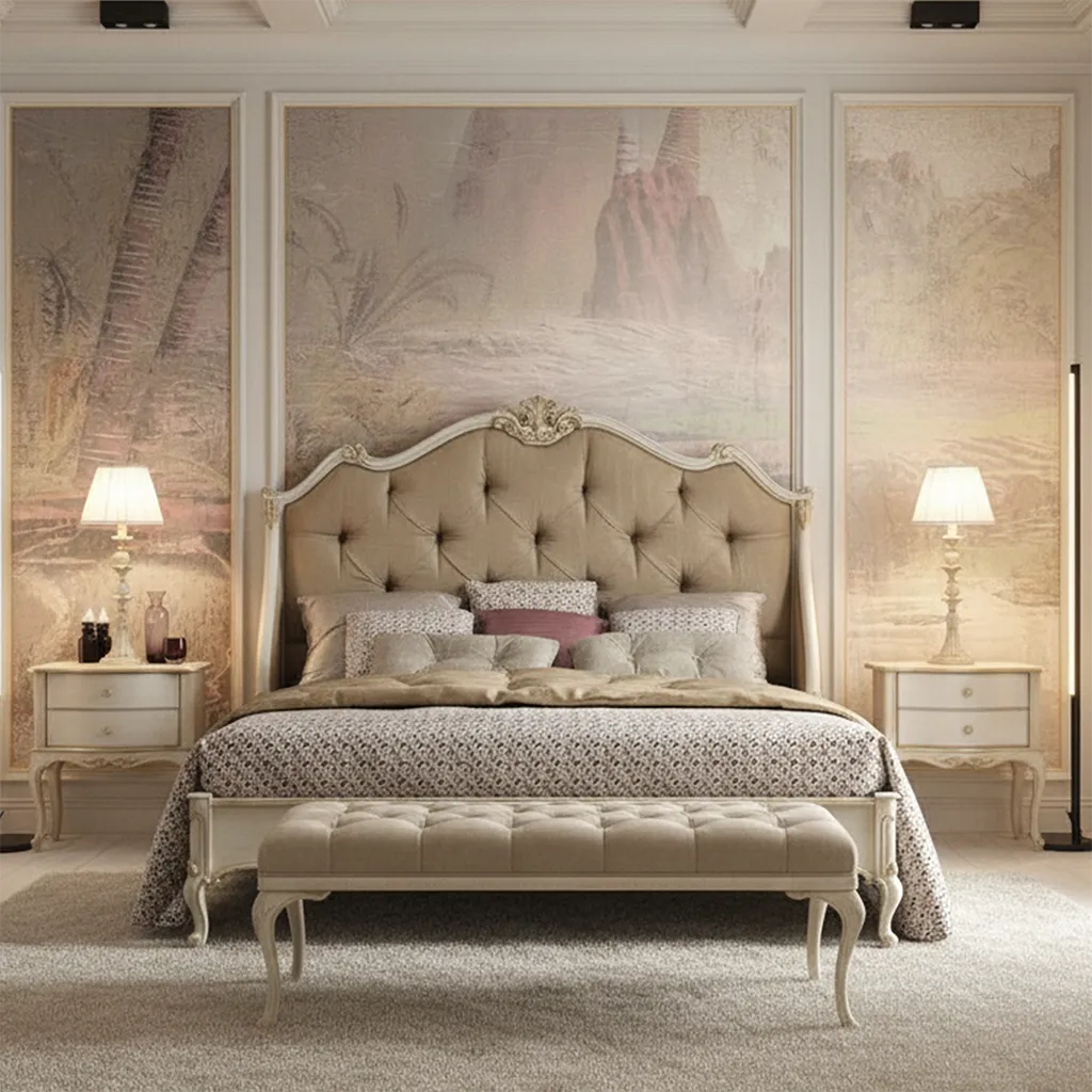 Bring timeless allure to your home with Crest. This antique style bed features intricate wood carvings, a soft tufted headboard, and a matching bench for added charm. The classic design is ideal for luxury bedrooms seeking a blend of vintage elegance and modern comfort.