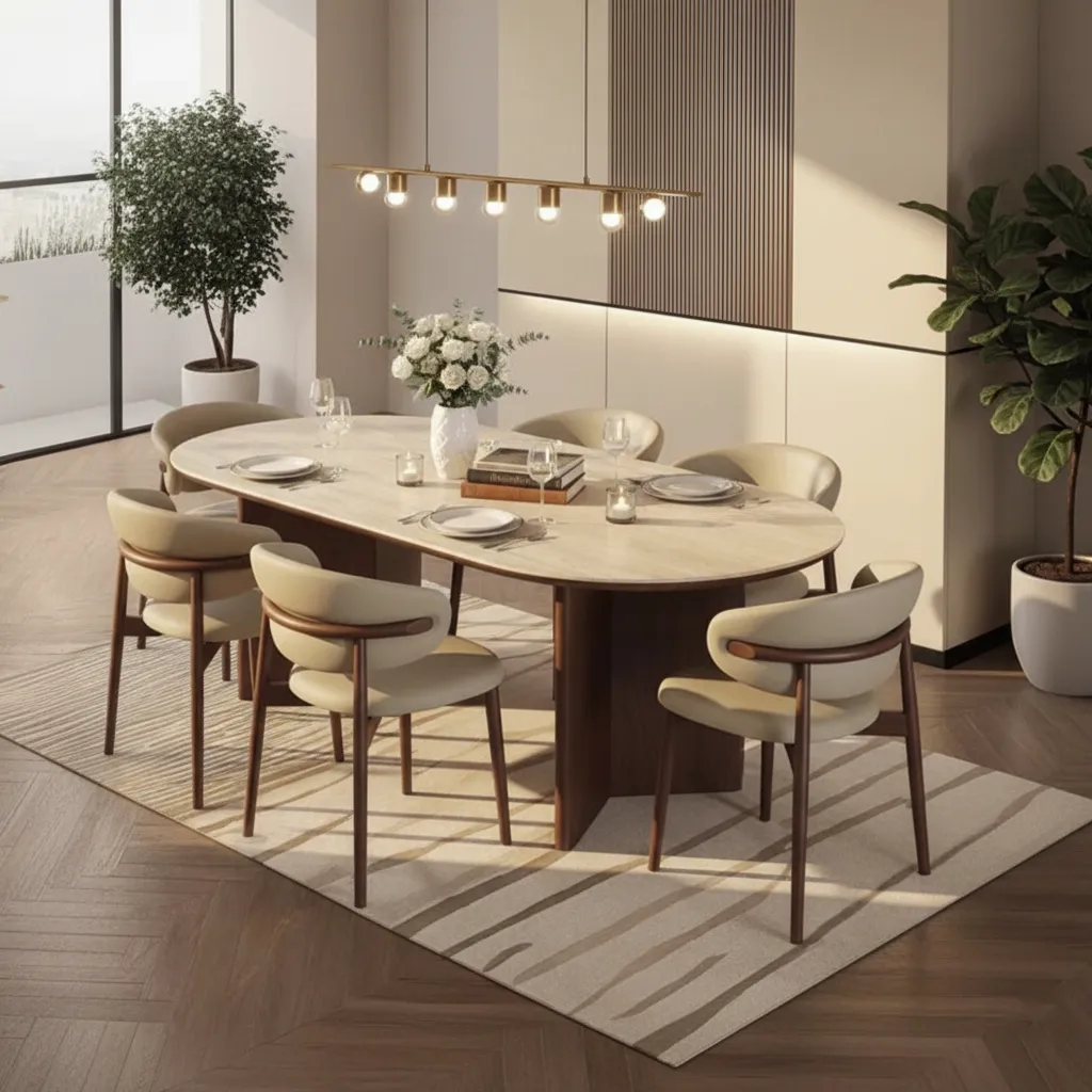 Fusion by Desires Furnishers brings contemporary elegance to your Pakistani dining room. This oval dining table, paired with stylish beige leather chairs and a striking modern chandelier, offers both comfort and artistry. Perfect for homes seeking a blend of trendsetting design, luxurious dining, and expert craftsmanship by Desires Furnishers.