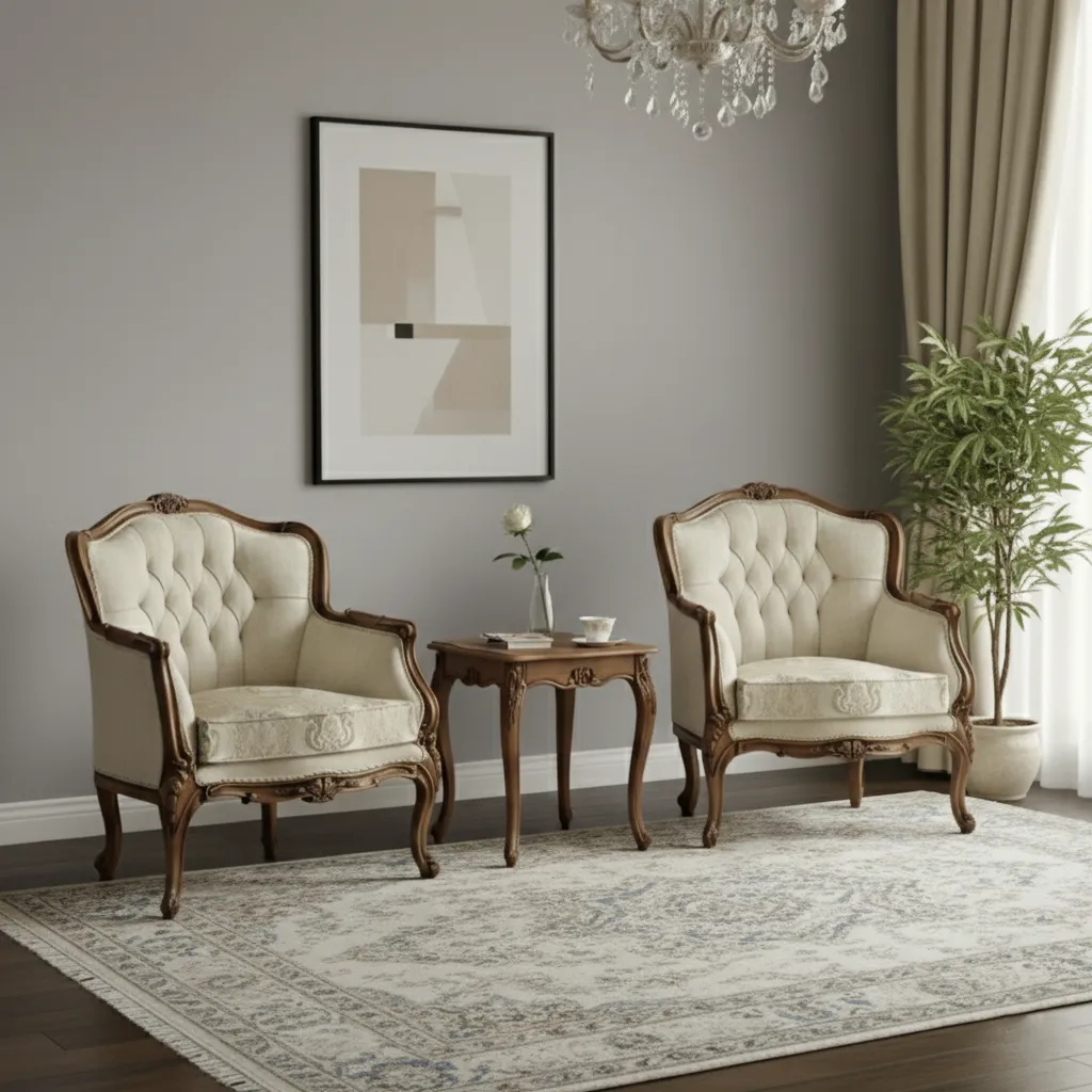 Ornate brings classic sophistication with button tufted upholstery, intricately carved wood legs and arms, and a rich vintage silhouette. Ideal for formal spaces or bedrooms, its luxury design complements elegant interiors and provides a regal seating experience.